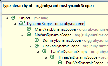 Up to this point, I have largely glossed over how the dynamic scoping gets it parentage. For static scope, we discussed that they were constructed by the parser as it scanned the program. A central component of the JRuby runtime (very central, actually) is the ThreadContext object. This is a ThreadLocal-like object (internally it uses a specialized RubyThread->SoftReference map, but the concept is roughly the same). As the runtime is executing, and is doing things like dispatching to methods, it will always consult with the ThreadContext to push and pop the dynamic scope for the current executing thread so it’s ready for the various nodes to use.