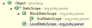 org.jruby.parserWe’ll get into the differences of these types momentarily. As the parser is traversing the language syntax, it creates a stack of static scope objects. The majority of the parser code is generated, so it’s not particularly beneficial for me to provide examples from the code on how it does this, but at a high-level calls are made at certain points in the parse routine to the methods ParserSupport.pushBlockScope, ParserSupport.pushLocalScope, and ParserSupport.popCurrentScope. These, as the method names indicate, create new scope objects as children of the current scope. Once created, they then subsequently become the current scope, and the old current scope is now their ’enclosing’ scope.