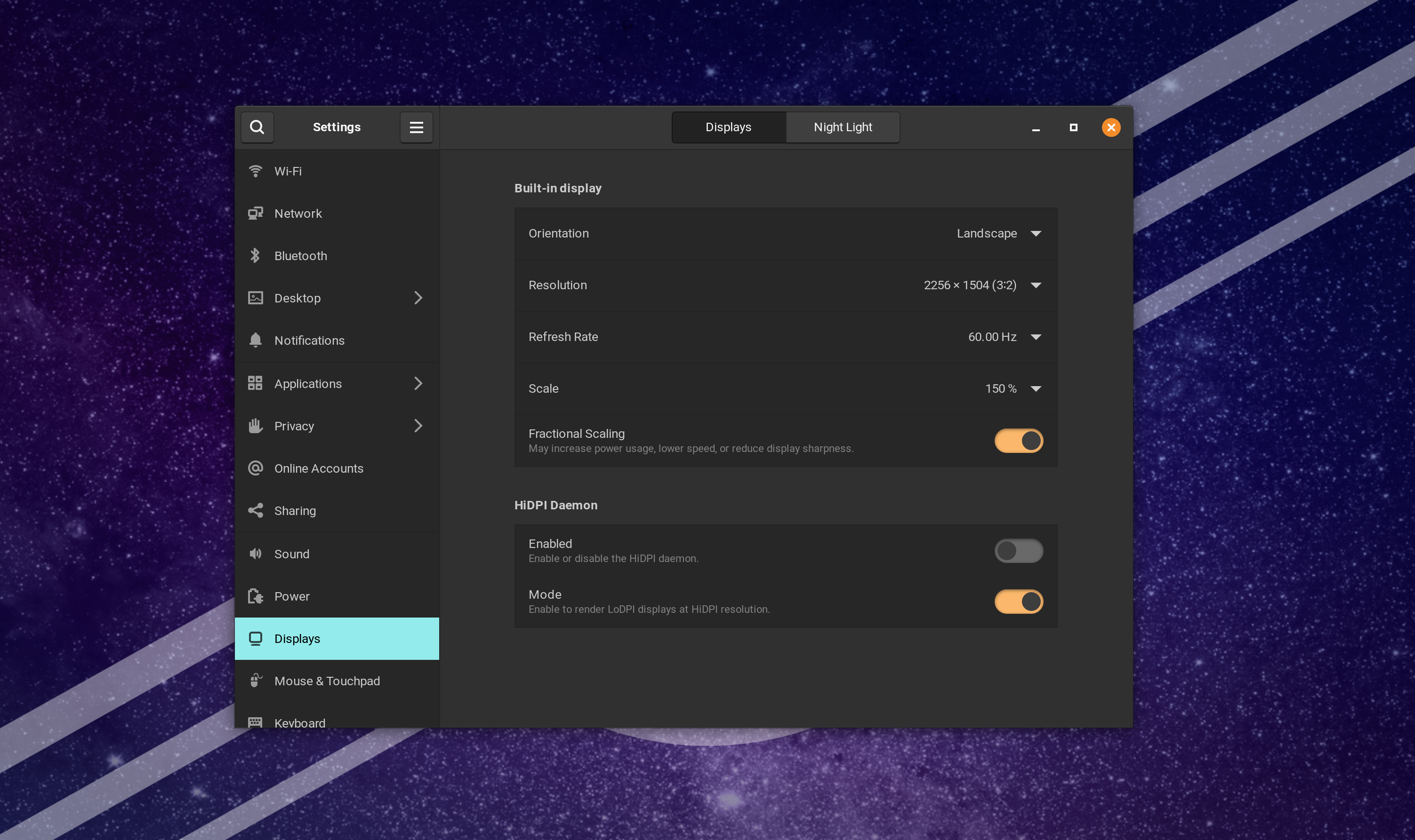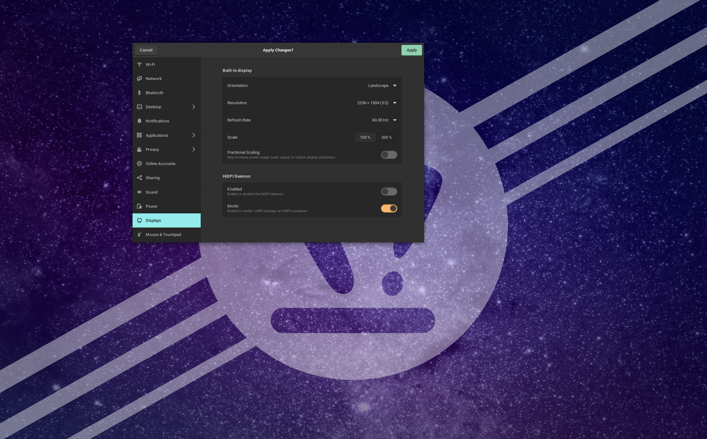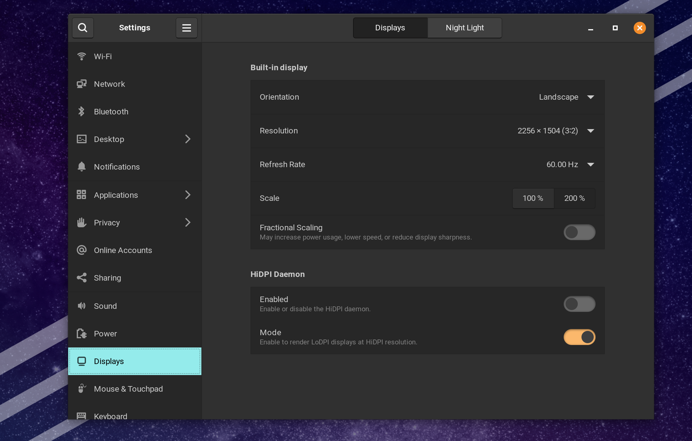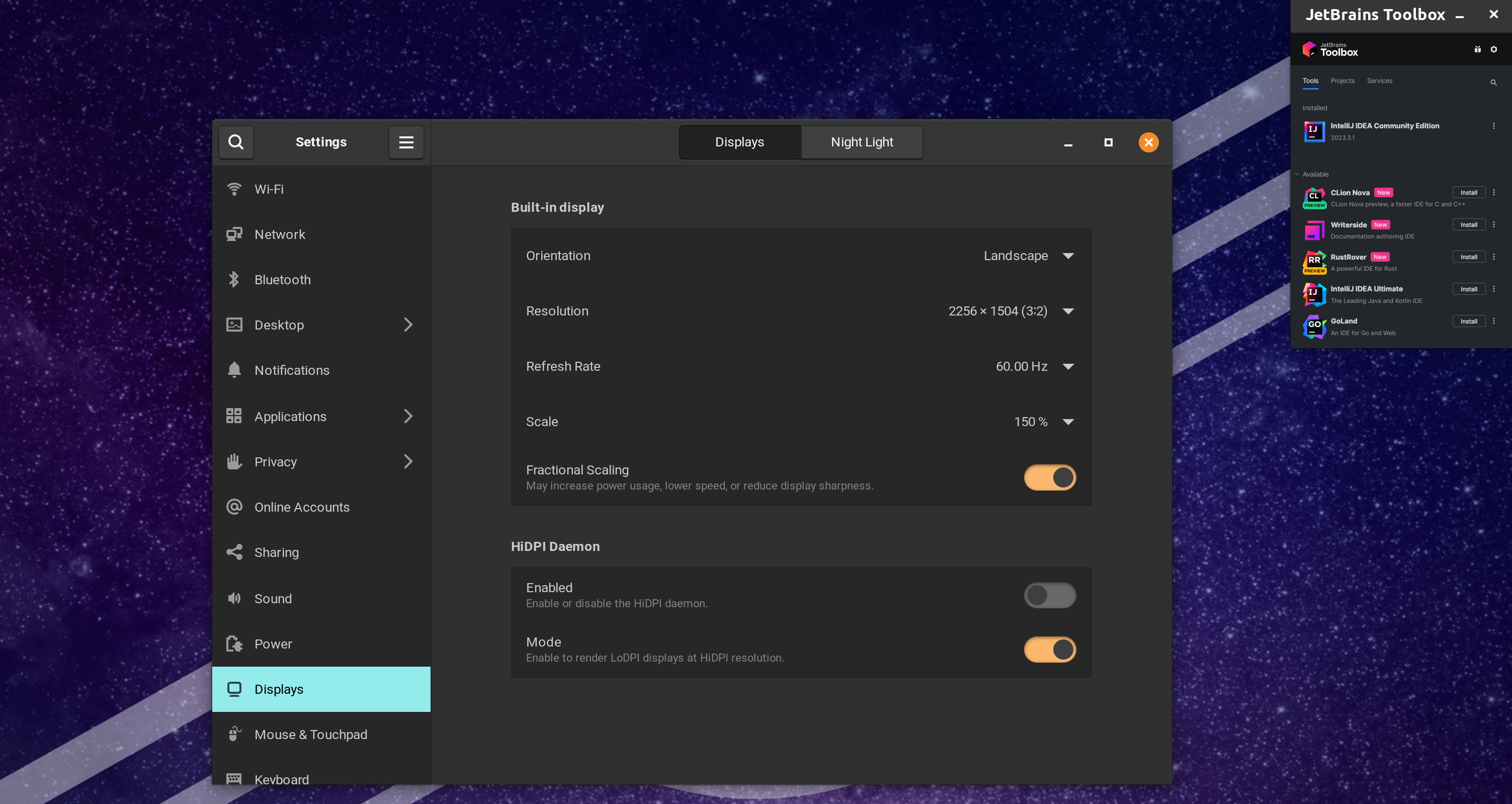 One challenge in particular is fractional scaling, which is the feature of scaling an app by a non-integer DPI. With the increase in HiDPI monitors, this has become increasingly important. I would challenge most people to try and be comfortable with a 13" Framework Laptop scaled at either 100% or 200%. 100% scaling looks tiny, and 200% scaling looks like a fisher price toy. Here are two screenshots that show the display settings and how much of the overall 13" screen they take up.